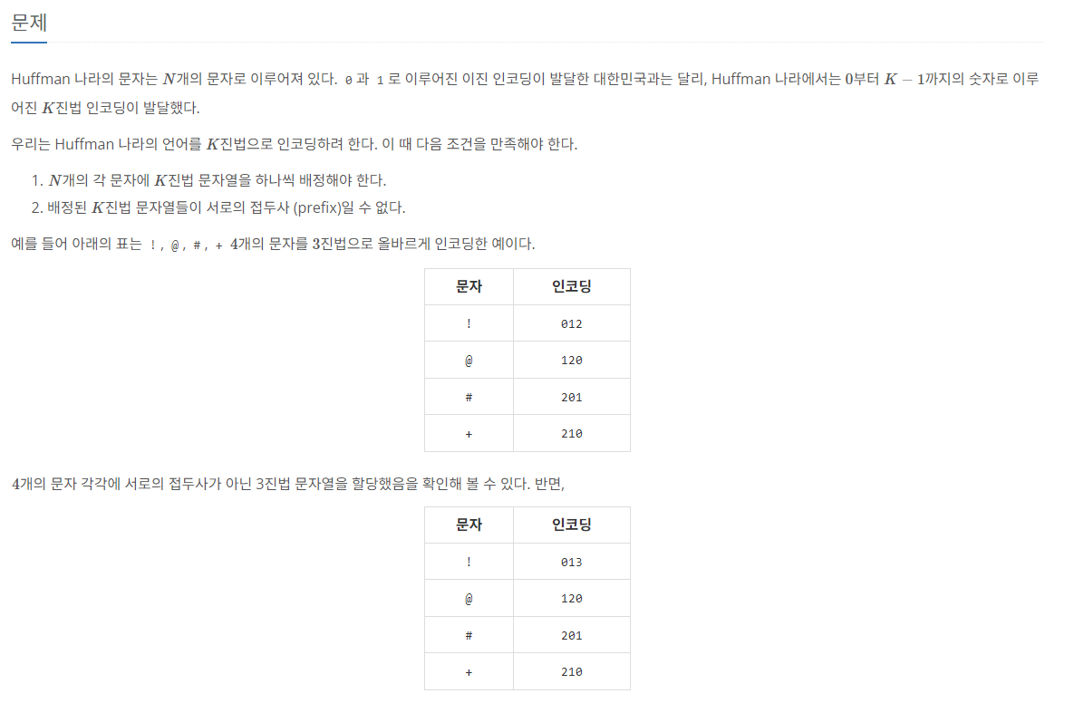 K진법이므로 일반적으로 2진법의 허프만 코드랑 다르게 가장 아래에 가장 적게 들어가지 않으면 최소 길이가 되지 않는다.