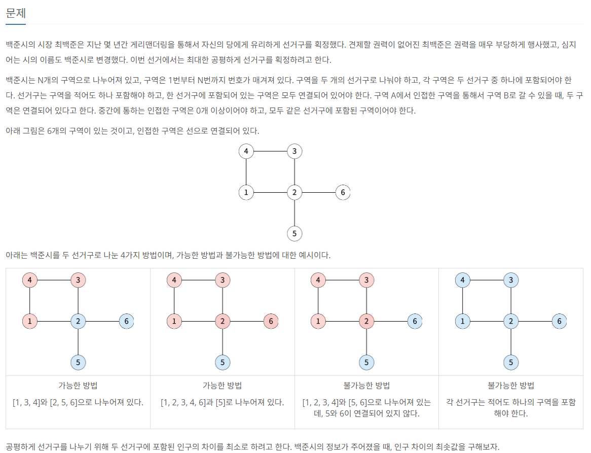 2. 그렇게 만들어진 선거구를 BFS를 통해 각각이 모두 연결되어 있는지 확인한다.