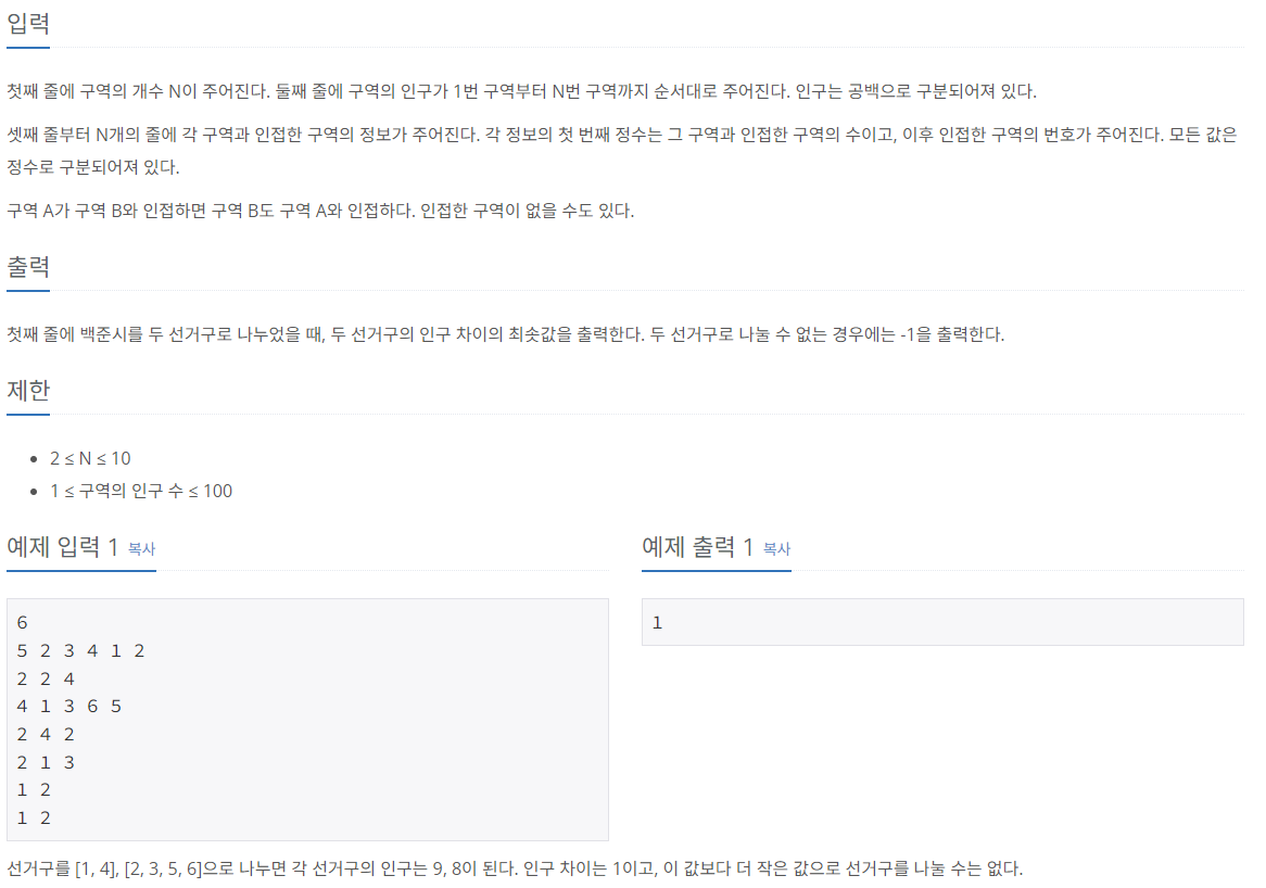 각 구역은 두 선거구 중 하나에 포함되어야 하고, 선거구는 구역을 적어도 하나 포함해야 하며, 한 선거구에 포함되어 있는 구역은 모두 연결되어 있어야 한다. 백준시를 두 선거구로 나누었을 때, 두 선거구의 인구 차이의 최솟값을 출력한다. 두 선거구로 나눌 수 없는 경우에는 -1을 출력한다.