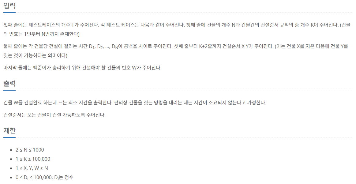 건물의 건설 순서가 주어질 때 특정 건물을 가장 빨리 지을 때까지 걸리는 최소시간을 출력한다.