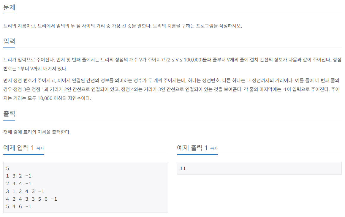 트리에서 임의 두 점 사이 거리의 최대값을 트리의 지름이라고 할 때 트리의 지름을 출력한다.