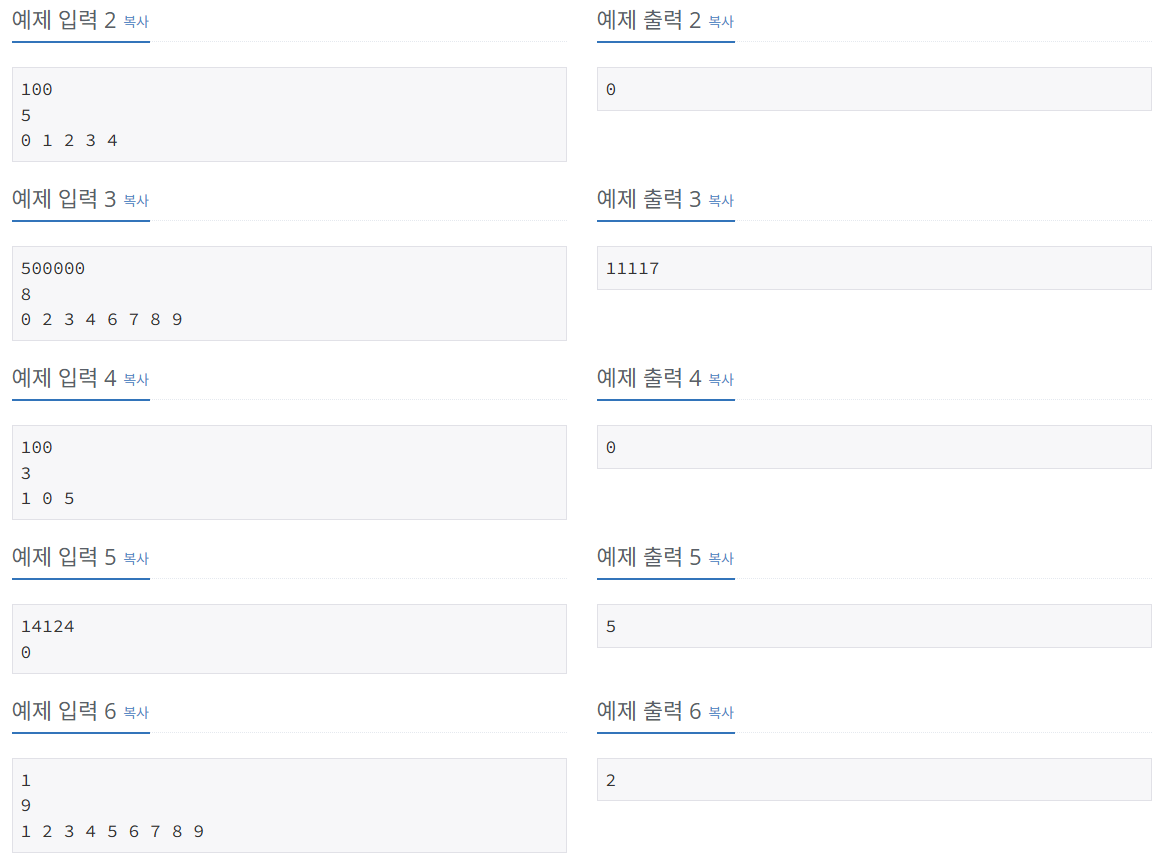 2. 0번부터 1000000번 까지 모든 채널에 대해서 고장난 버튼의 번호가 있는지 없는지 확인한다.