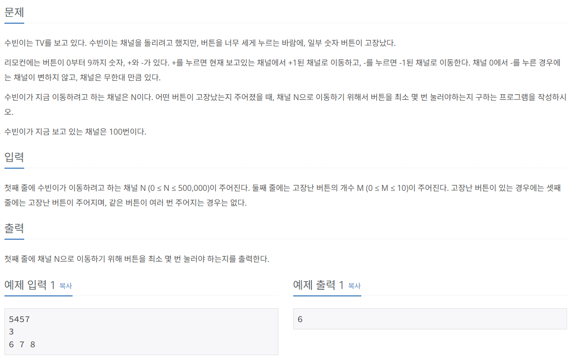 100번에서 리모콘을 이용해서 N번 채널로 옮기려고 한다. +를 누르면 현재 보고있는 채널에서 +1된 채널로 이동하고, -를 누르면 -1된 채널로 이동한다. 채널 0에서 -를 누른 경우에는 채널이 변하지 않는다. 또한 M개의 고장난 버튼이 주어질 때 채널 N으로 이동하기 위해 버튼을 최소 몇 번 눌러야 하는지 출력한다.