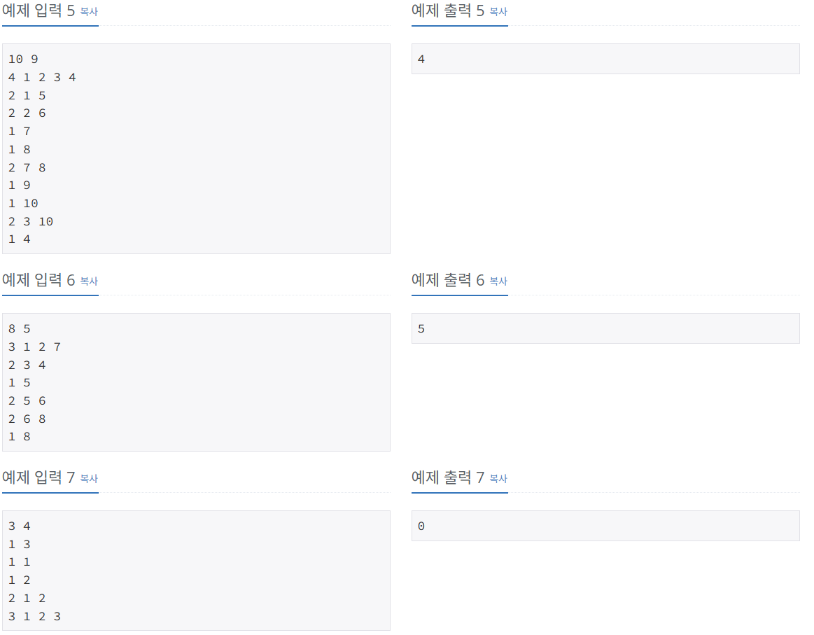 사람의 수 N과 파티의 수 M와 진실을 아는 사람의 수와 번호, 각 파티에 오는 사람들의 번호가 주어질 때, 지민이가 거짓말쟁이로 알려지지 않으면서, 과장된 이야기를 할 수 있는 파티 개수의 최댓값을 출력한다.