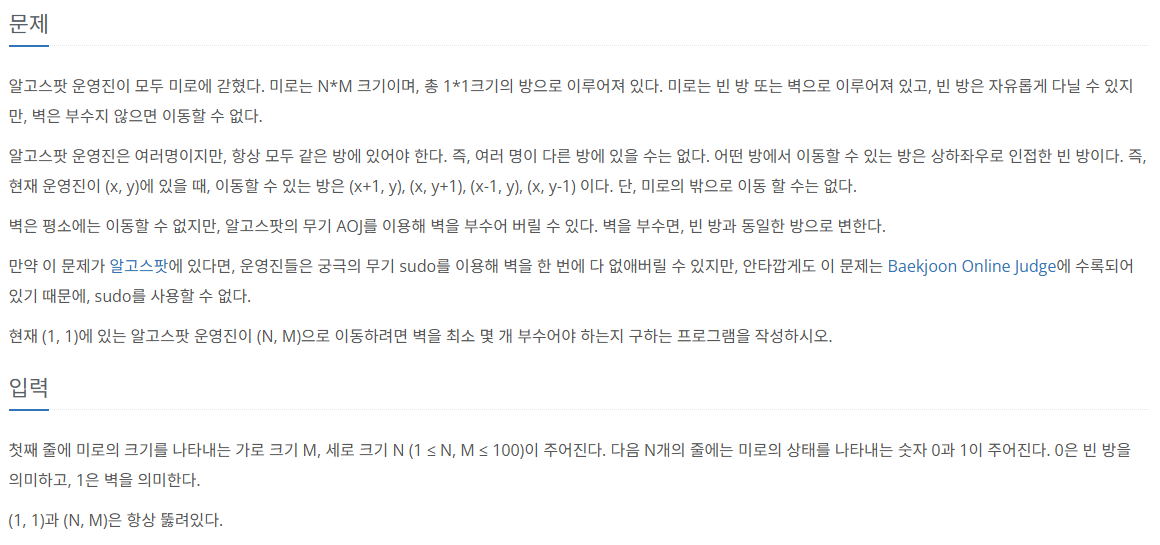 상하좌우로 움직일 수 있고, 벽을 부술 수 있으며 미로의 크기를 나타내는 가로 M, 세로 N이 주어질 때, (N, M)으로 이동하려면 벽을 부수어야 하는 최소값을 출력한다.