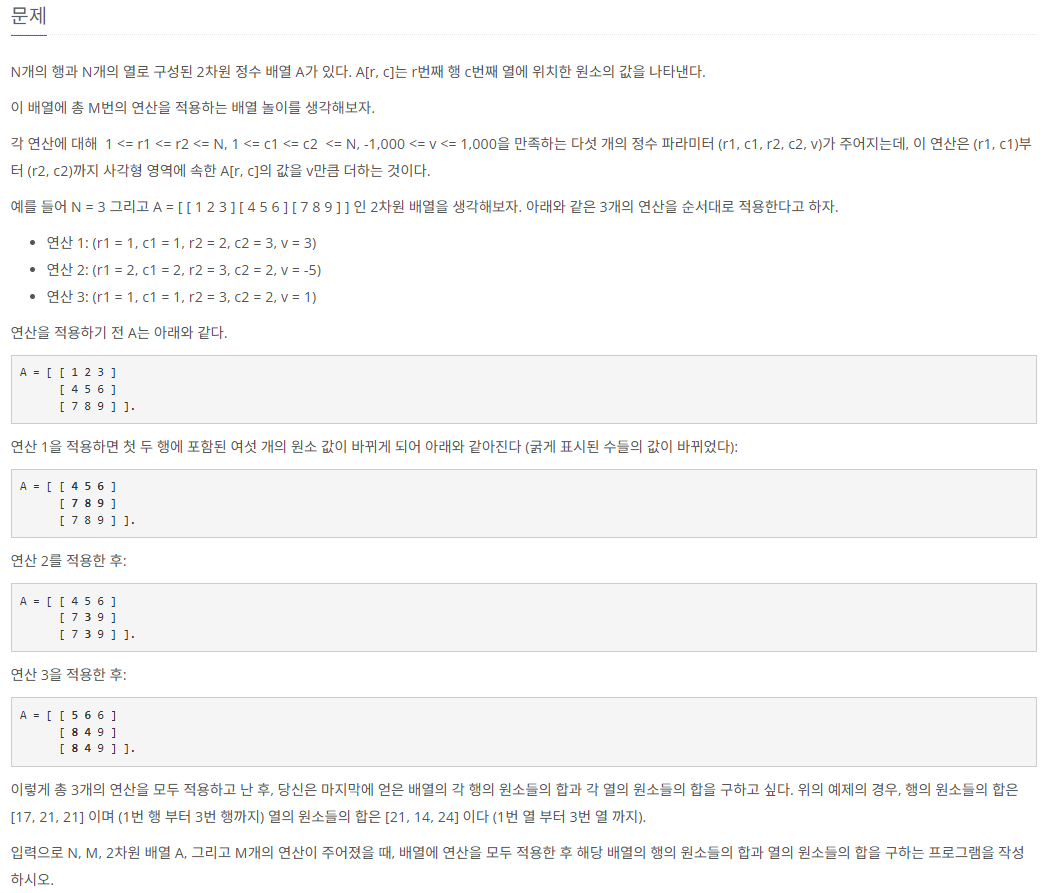 (r1, c1, r2, c2, v)가 주어지는데, 이 연산은 (r1, c1)부터 (r2, c2)까지 사각형 영역에 속한 A[r, c]의 값을 v만큼 더하는 것일 때, N개의 정수로 표현된 각 행의 합과 열의 합을을 공백으로 구분하여 출력한다.